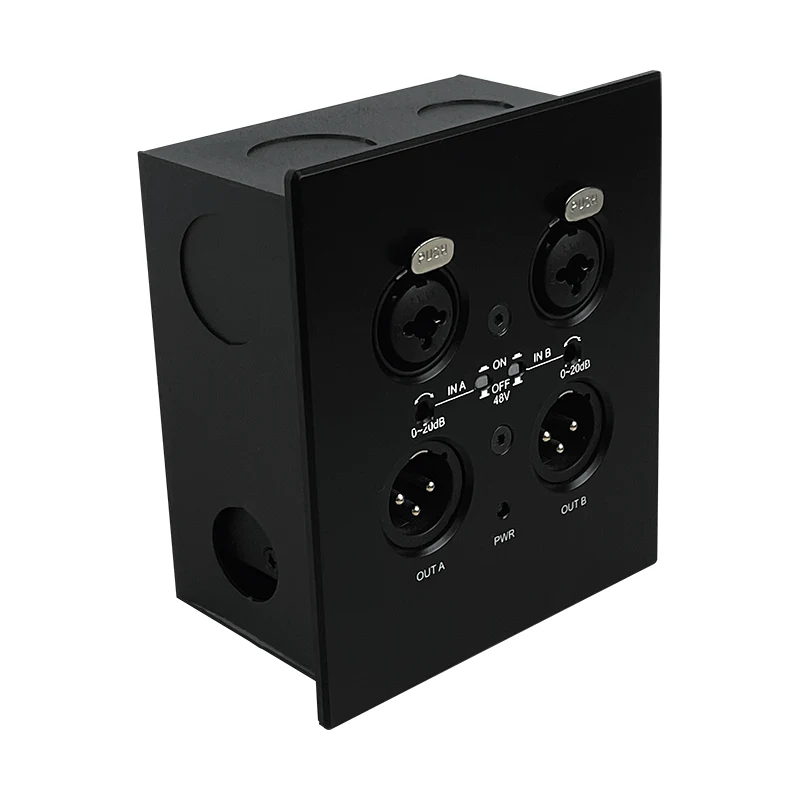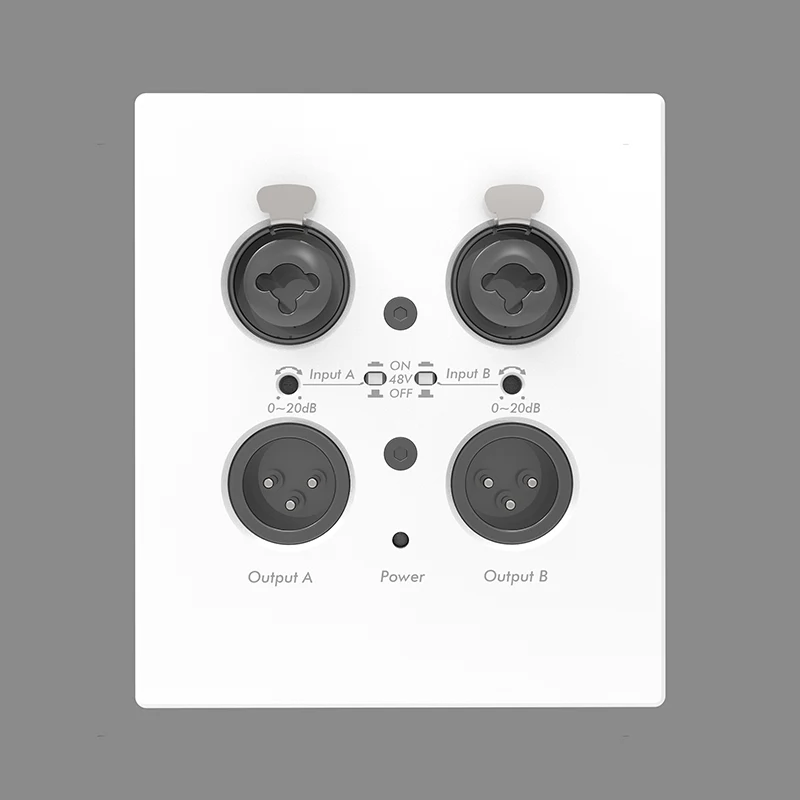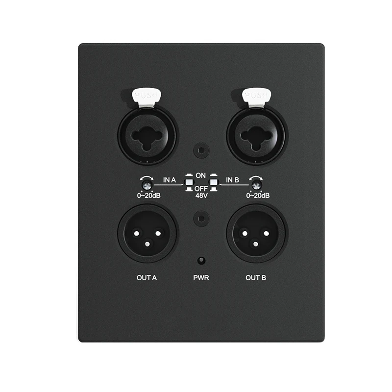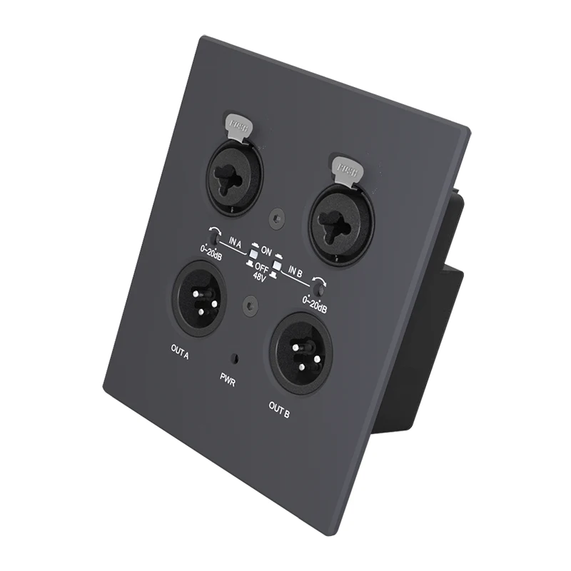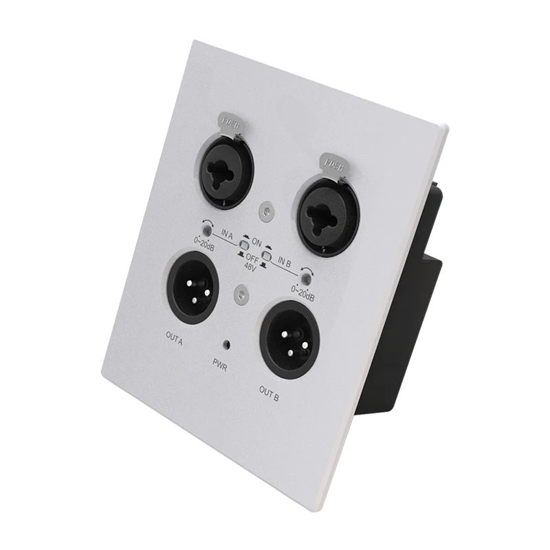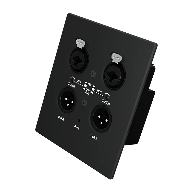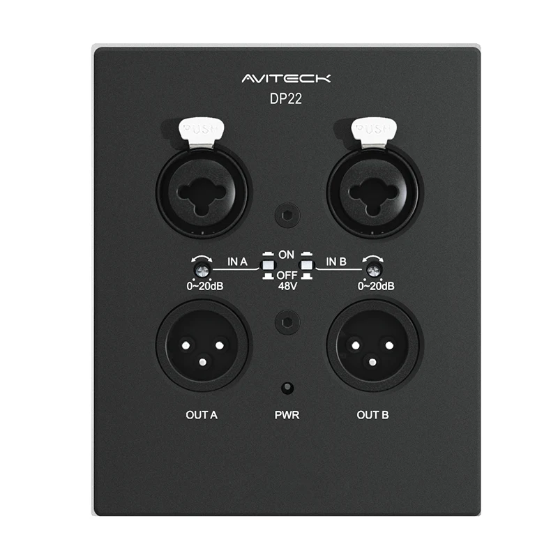 FHBAVTEC® Dante 2 CH Wall Plate Network-Audio-Schnittstelle (DP22) verfügt über ein integriertes Dante-Modul für Analog-to-Dante-Digital-Signalübertragung und einen Doppelkanal-Eingangs-Phantom-Power-Switch. Ein weiteres großartiges Feature ist, dass es PoE -Antrieb sein kann.